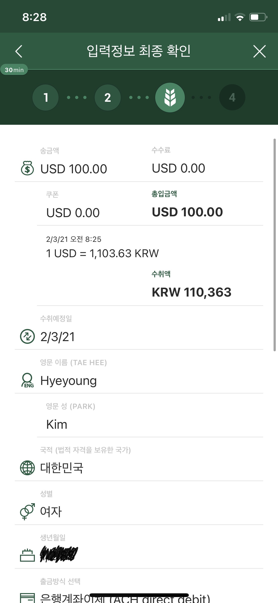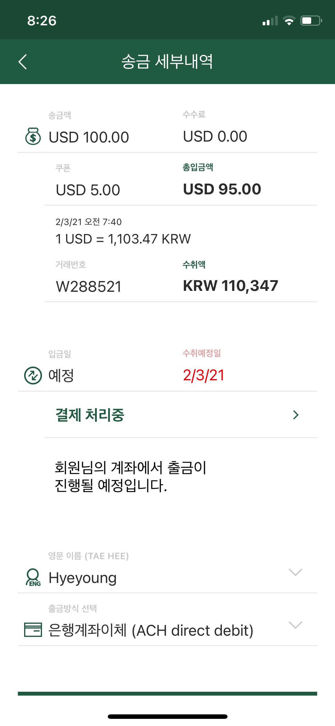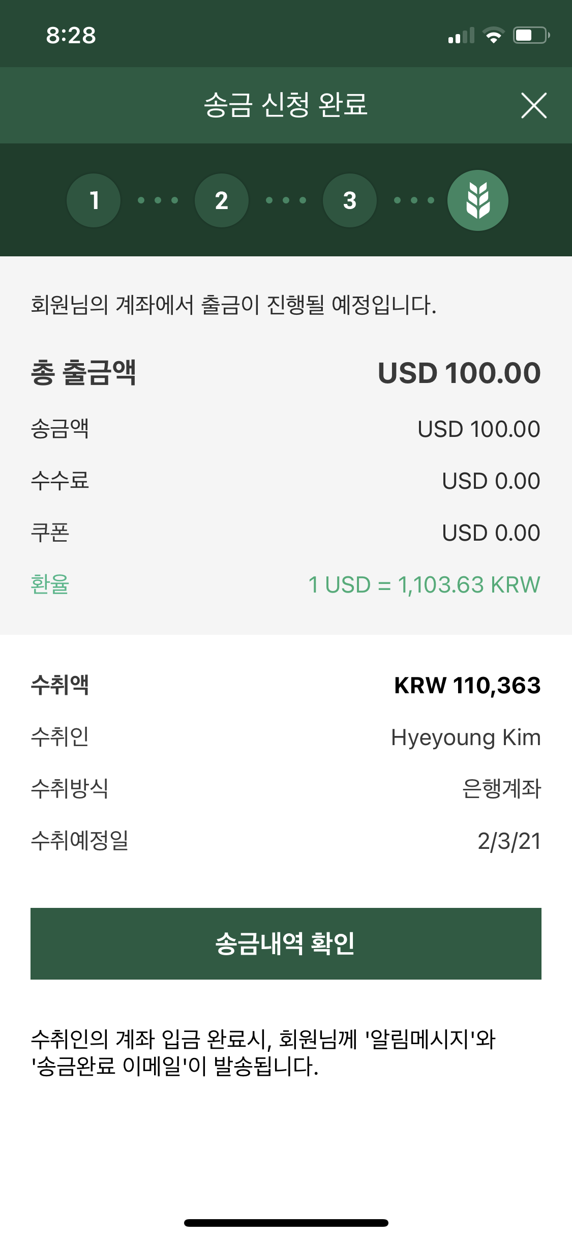 몇분 만에 미국에서 한국으로 송금이 모두 이루어지더라구요.